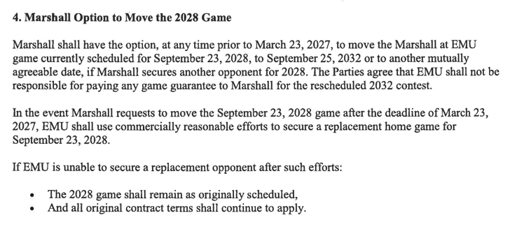 Marshall replaced EMU with an FCS game, and EMU must replace Marshall with a different home game if it flexes out of the 2028 spot. If EMU can’t find a replacement game, then “the 2028 game shall remain as originally scheduled,” and “all original terms shall continue to apply.” If EMU is able to find a replacement opponent, then Marshall will pay EMU $50,000 no later than Sept. 23, 2028, and EMU will not have to pay a game guarantee in 2032.