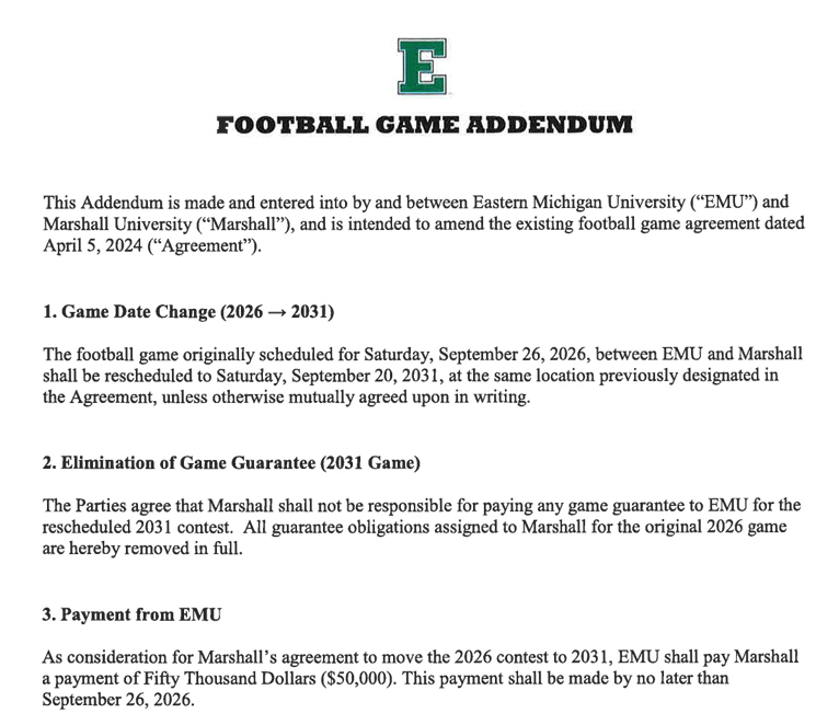 With this initial schedule change, Marshall is no longer on the hook for a game guarantee to EMU. Still, EMU must pay Marshall $50,000 no later than Sept. 26 — the date of the originally-scheduled game.