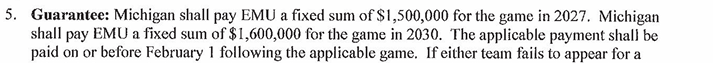 In EMU and Marshall’s game addendum, the two agreed to the 5-year delay on Marshall’s home game. But here’s how the EMU-Marshall game guarantees can both go from $150,000 each way to $0. Since Wisconsin called EMU out of the blue to write a Big Ten-sized check to replace Pitt on the schedule, Marshall’s also going to get the chance to kick the can on EMU to play a payday game instead, too.