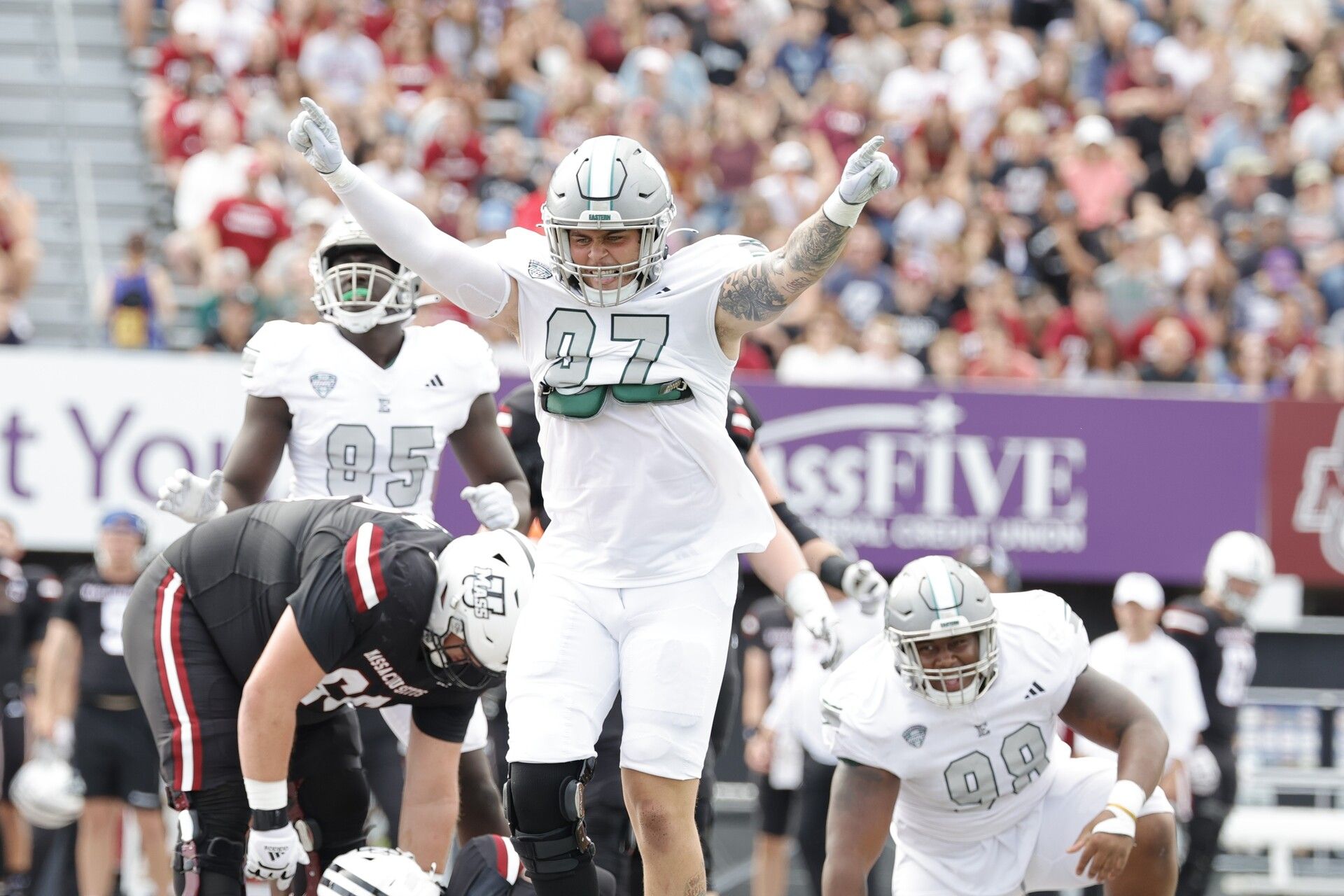 But EMU’s defense still battled back, and would end up trying a 46-yard field goal attempt on its next fourth-down play. The kick was nowhere near good, and EMU’s defense hung onto the 10-point lead as it got the ball back.