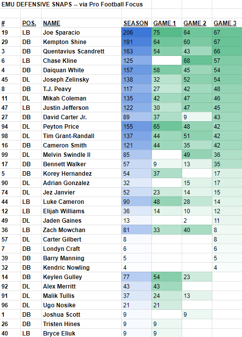 EMU’s depth chart listed in this week’s game notes are detailed below along with players’ snap counts (via Pro Football Focus), quotes from EMU head coach Chris Creighton during Monday’s press conferences, and some of my notes as well.