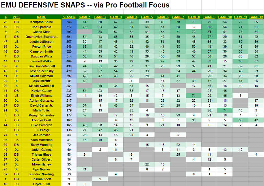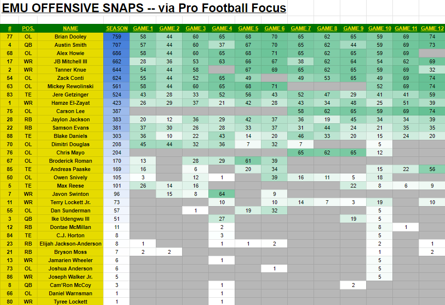 EMU had its press conference leading up to the 68 Ventures Bowl Thursday. Below is the team’s listed depth chart from the game notes provided, along with season-long snap counts from Pro Football Focus, and some notes.