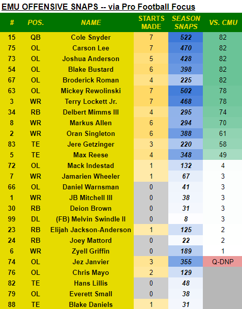 EMU’s published depth chart from its weekly game notes is posted below, along with players’ snap count totals from the Central game and their respective seasons (via Pro Football Focus).
