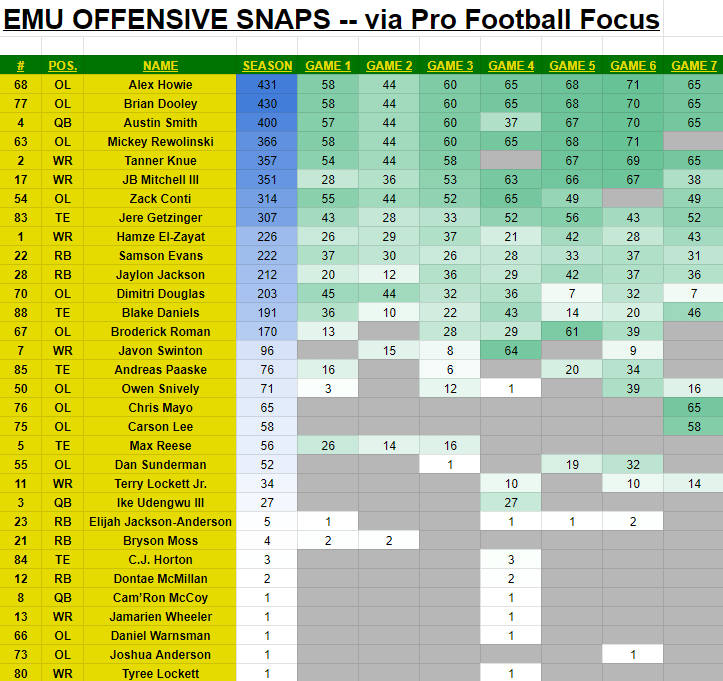 EMU’s version of an updated depth chart is included with its weekly game notes, and that information is listed below along with quotes from the presser, snap counts (from Pro Football Focus), and some notes from me.
