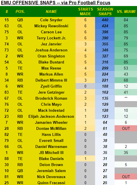 EMU’s published depth chart is found in its weekly game notes, and I’ve noted each player’s snap count totals (via Pro Football Focus) and starts made this season.