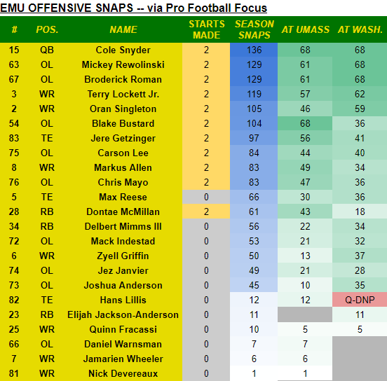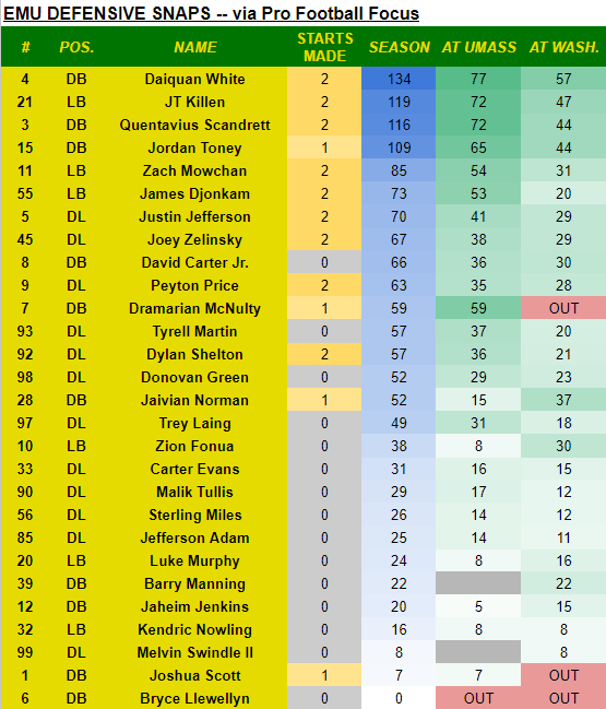 With the new week comes a new depth chart report. EMU puts out a public depth chart via its game notes. I’ve shared what EMU has below, with some of my notes, along with players’ total snap counts via Pro Football Focus.