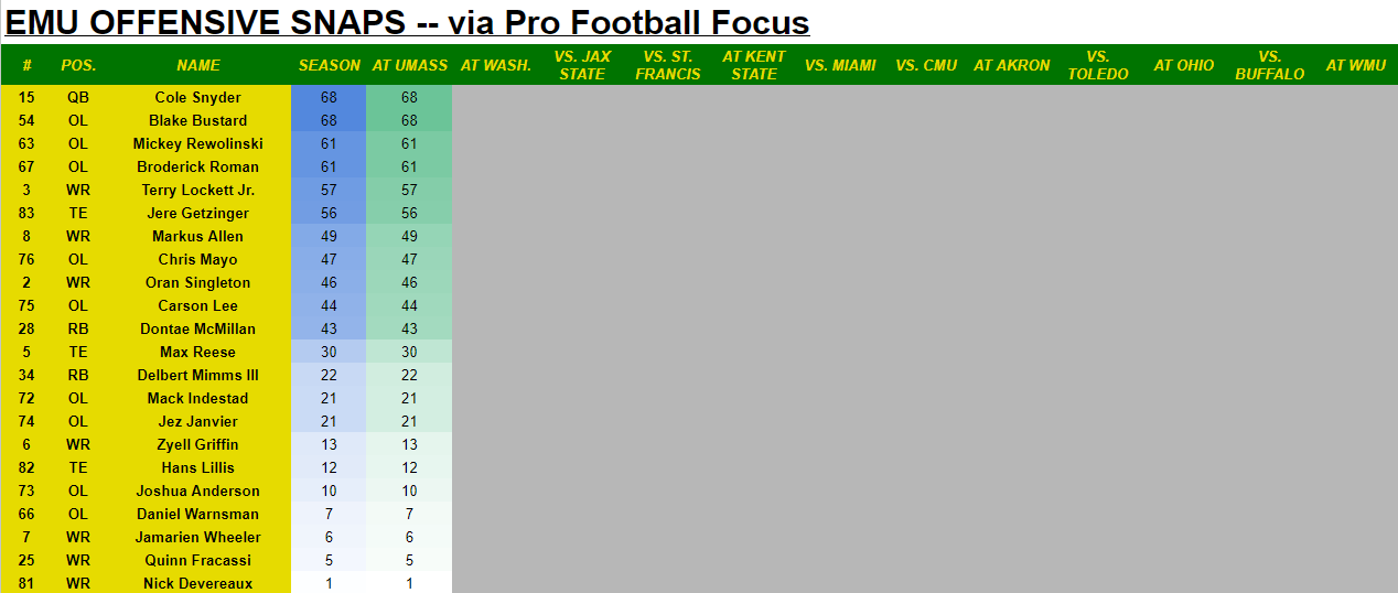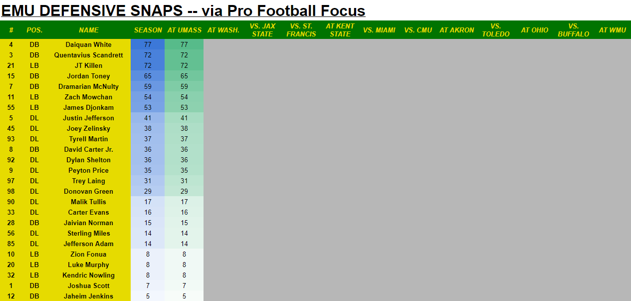 Of the guys not listed in the two deep, Carter Evans returned from injury for 16 plays, Sterling MIles came back from injury too with 14 snaps. Jefferson Adam made his EMU debut for 14 plays. And interior D-lineman Donovan Green had 29 plays.