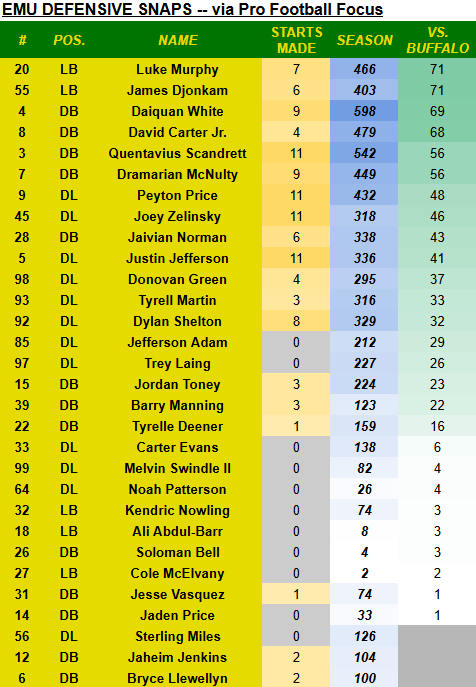 EMU, as always, has its two-deeps published inside of its weekly game notes, and the proper notes are scribbled below along with players’ Buffalo week and season-long snap counts.