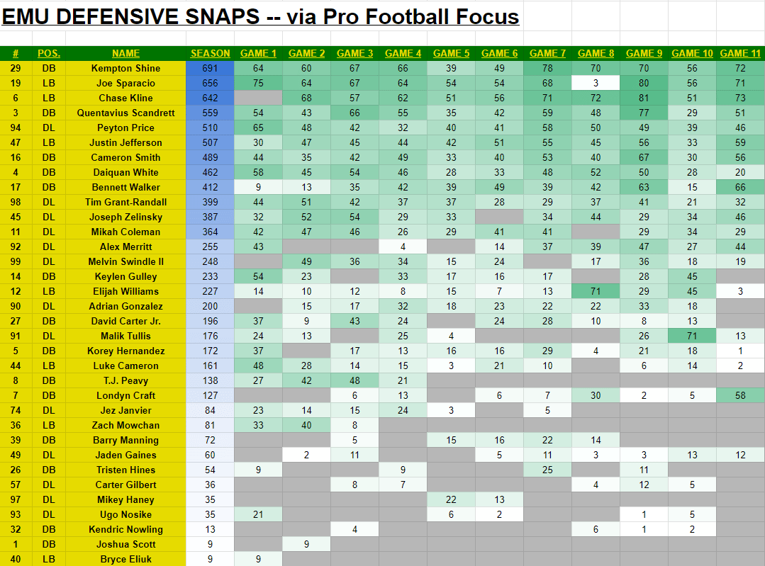 Tanner Knue (48 rec., 472 yards, 3 TD) and Hamze El-Zayat (25 rec., 370 yards, 2 TD) lead EMU’s receiving efforts by yards. J.B. Mitchell’s production has had a rising role on the team in the first-half of the season. The ball hasn’t gone his way as much in the second-half, but caught 7 passes against Ball State, 5 against each of CMU and WMU, but only 4 grabs for 40 over the last couple of games.