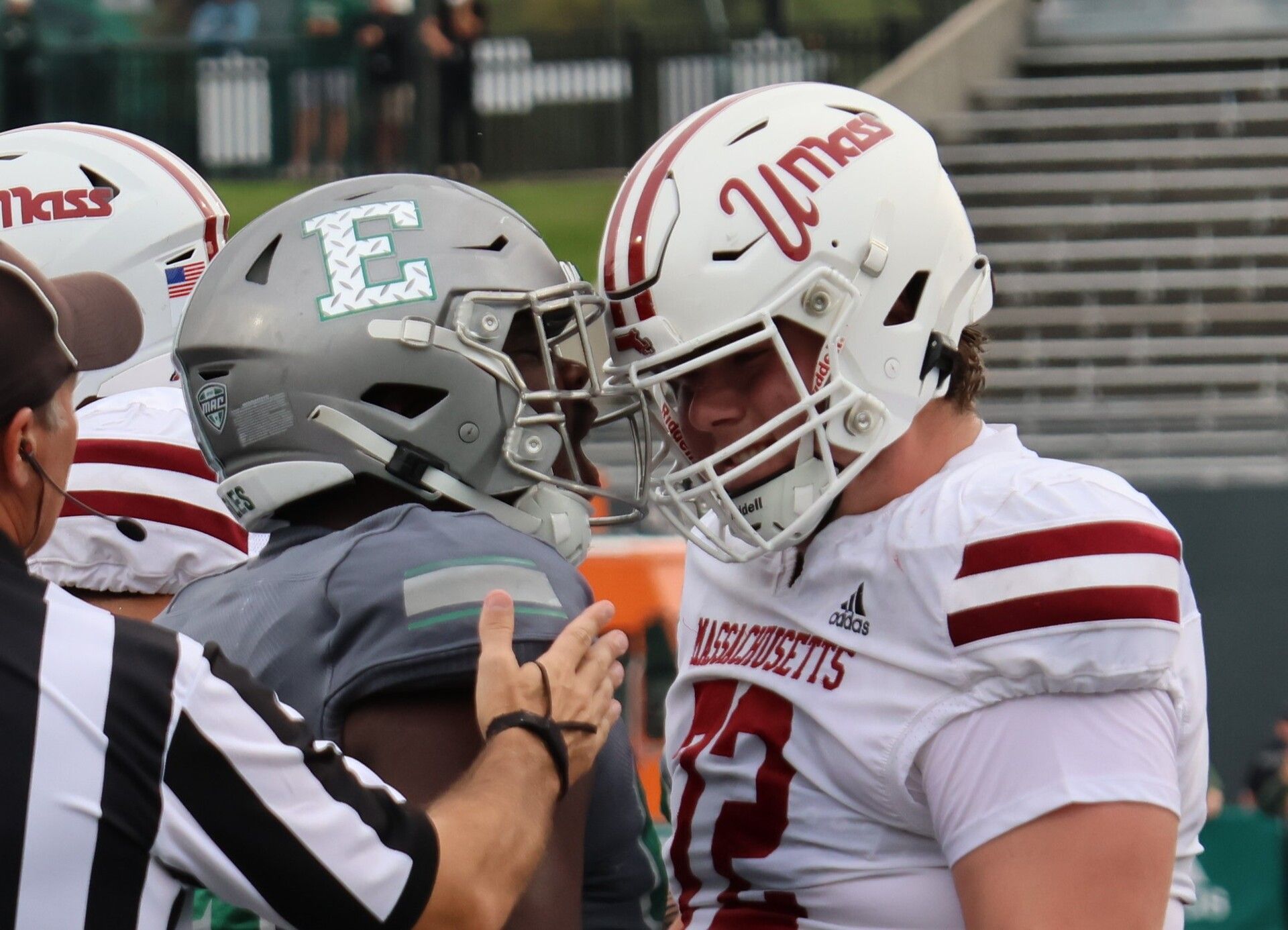 Four straight pass completions (one fly-sweep) and a 15-yard facemask penalty gave Eastern a fresh set of downs on the 45-yard line. Then Jaylon Jackson out-ran the Minutemen defense on a read option handoff for the game’s first touchdown and a 10-0 lead.